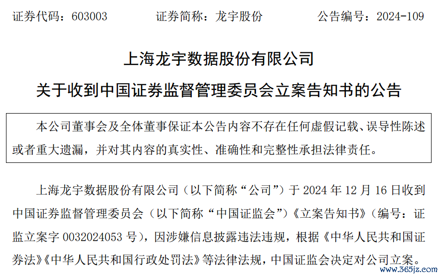 12月16日,*ST龙宇收到中国证监会下发的《立案告知书》。《立案告知书》显示,公司因涉嫌信息披露违法违规被中国证监立案。