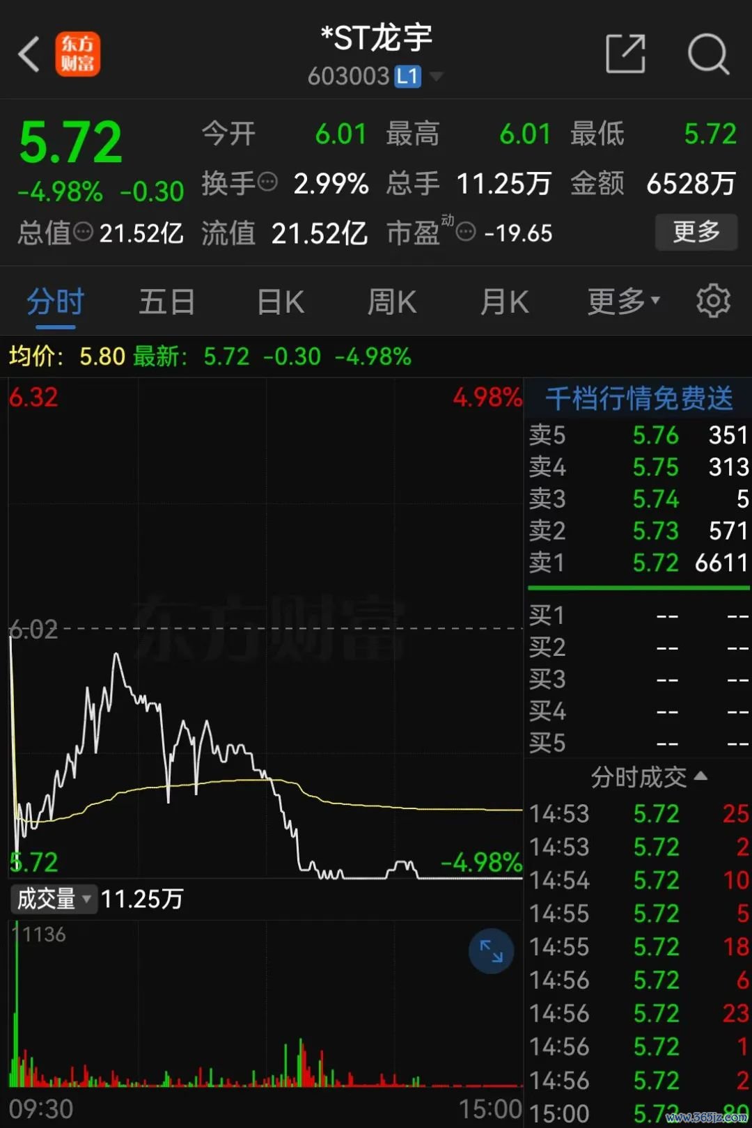 12月16日收盘,*ST龙宇的股价报5.72元/股,跌幅达4.98%,总市值为21.52亿元。东财choice数据显示,9月30日,*ST龙宇的股东户数达2.443万。